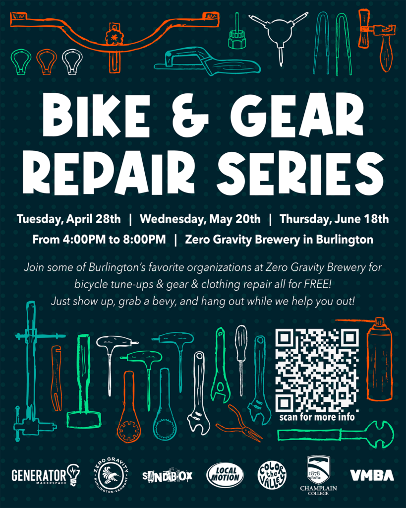 Join some of Burlington’s favorite organizations at Zero Gravity for a fun, FREE, hands-on, community powered Bike & Gear Repair Series on the following dates: